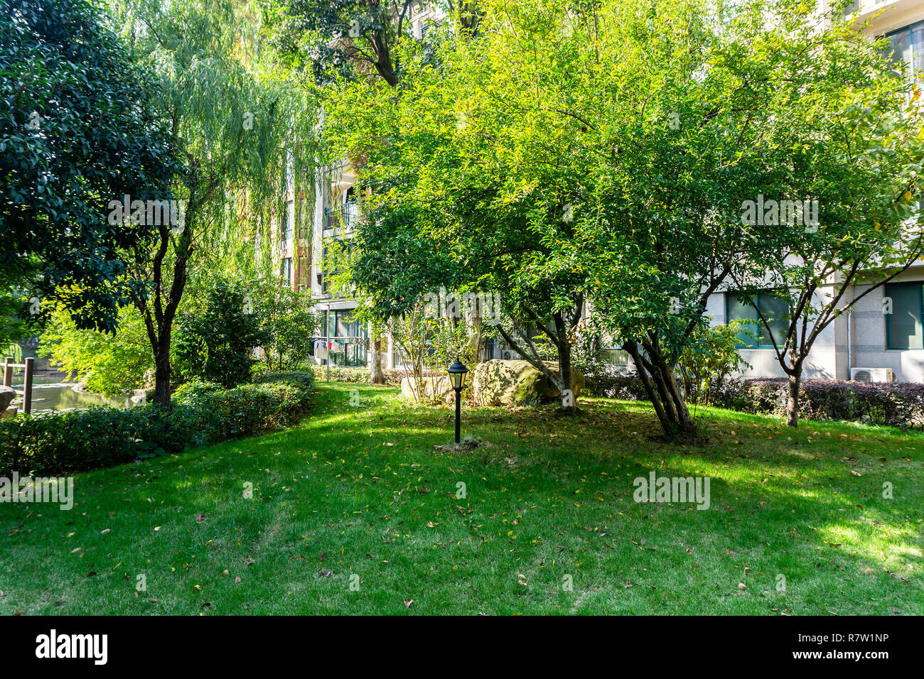 Garden Lights On Grass With Trees And Apartment Buildings In