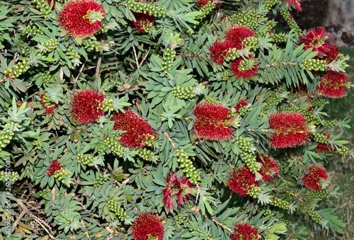 Red Bottle Brush Flowers Blooming On An Ornamental Garden Hedge In