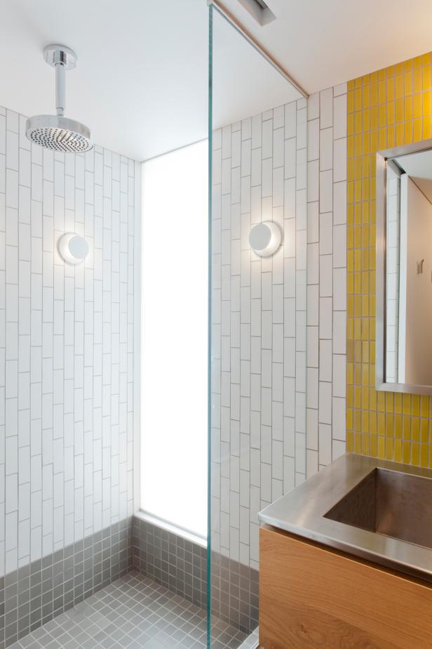 Modern White And Yellow Tiled Bathroom With Glass Shower Hgtv
