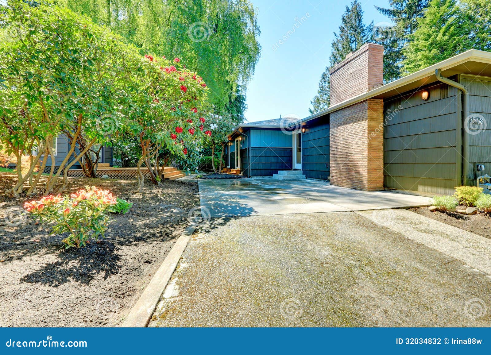 Small Blue House With Garage And Large Front Yard With Trees