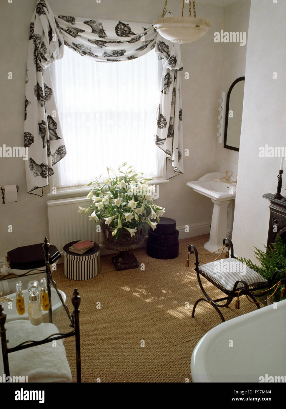 Black White Draped Fabric On Window In Eighties Bathroom With
