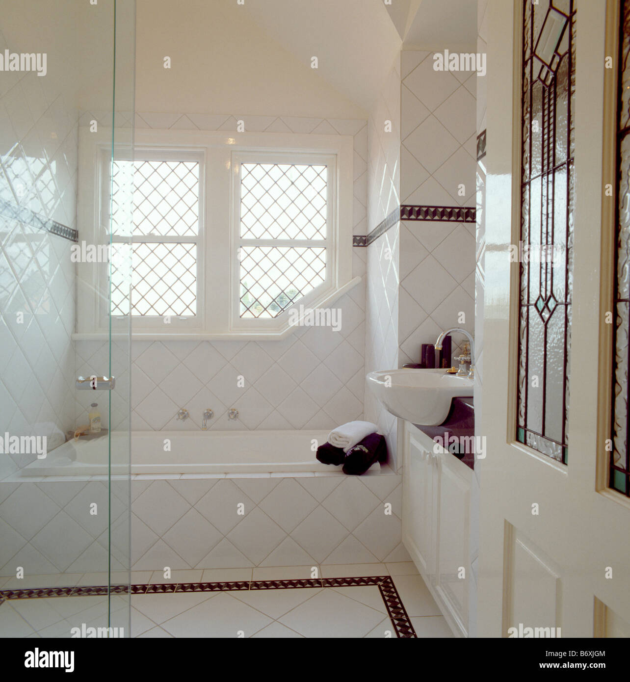Glass Door On Walk In Shower In Modern White Bathroom With Glass