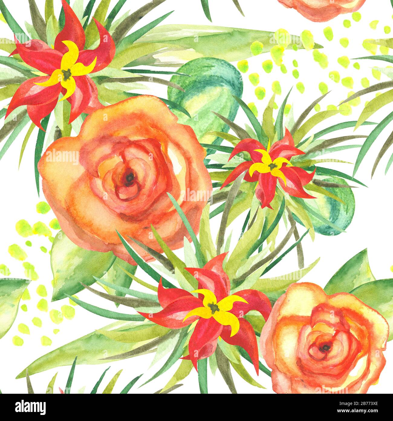 Seamless Pattern Of Watercolor Tropical Plants With Blooming