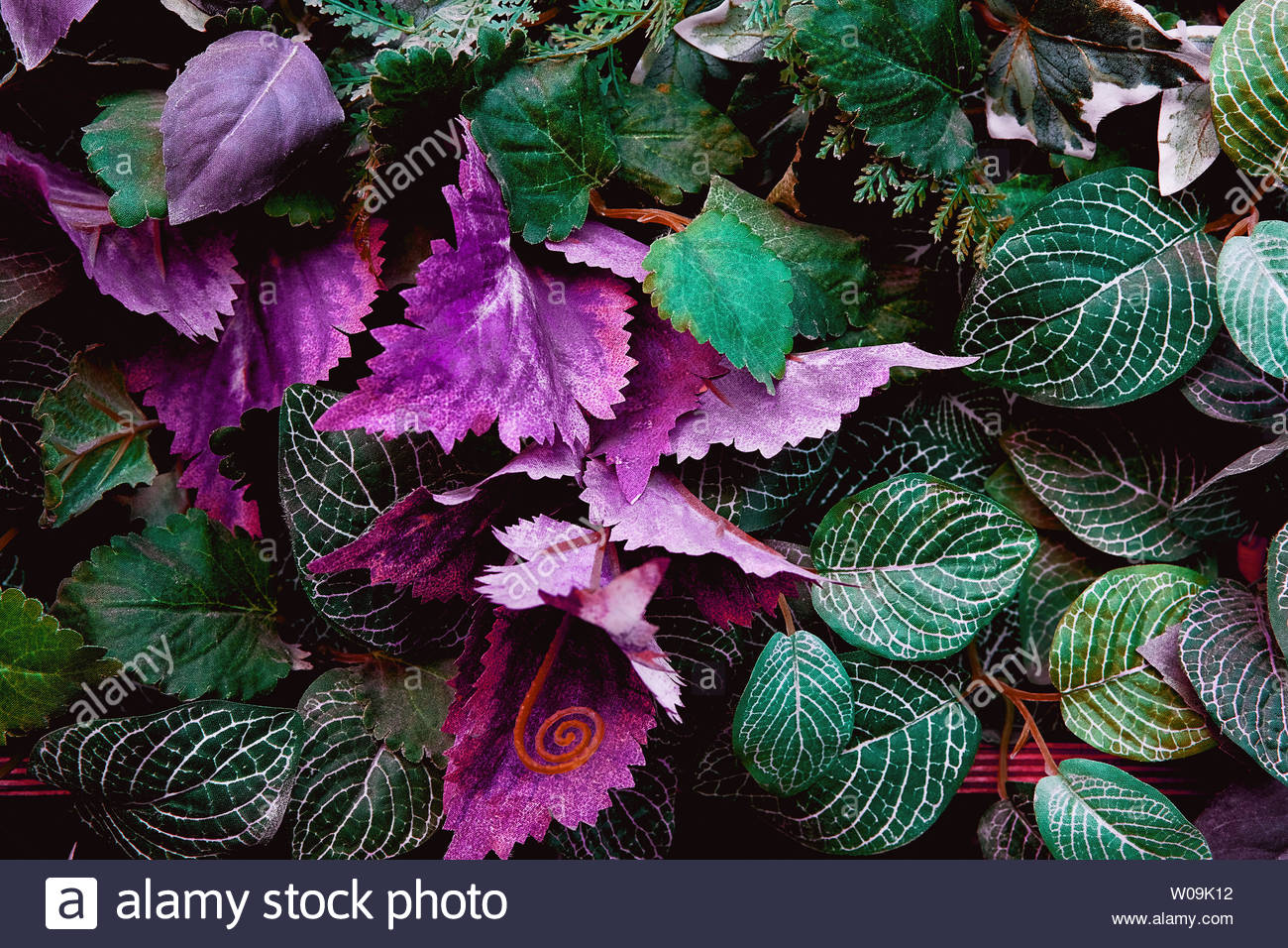 Artificial Abstract Green And Purple Tropical Leaves Texture