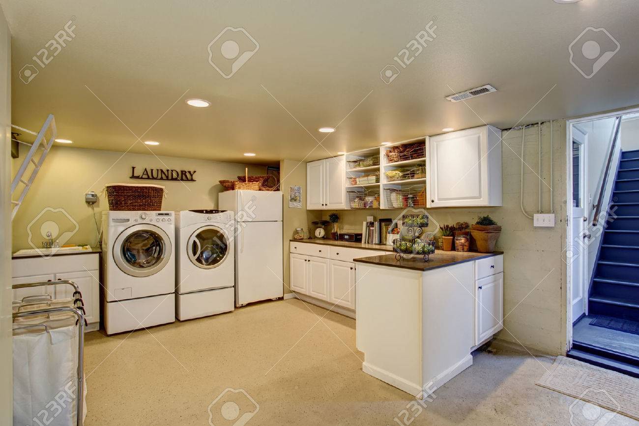 Large Laundry Room With Appliances And White Cabinets Stock Photo