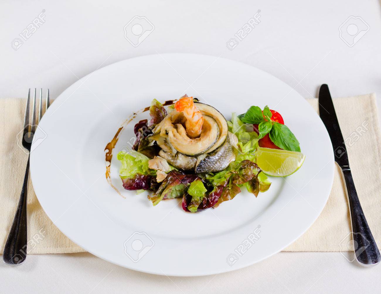 Delicious Main Dish Of Fish And Shrimp Meat And Veggies