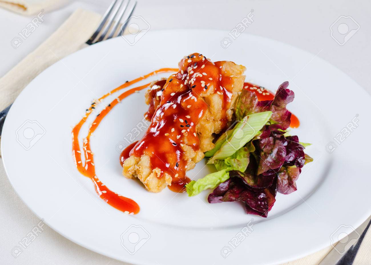 Close Up Delicious Main Dish Of Saucy Crispy Fried Chicken With