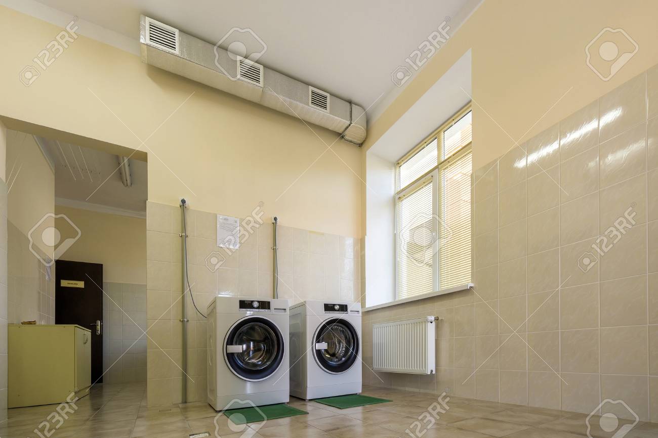 Modern New Industrial Washing Machines In Clean Tiled Bathroom Or