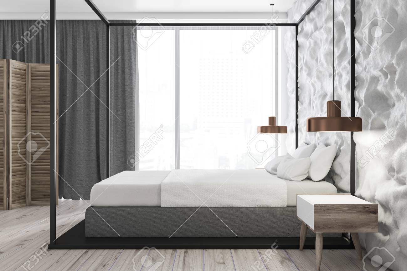 Side View Of Modern Bedroom With Crude White Walls Concrete