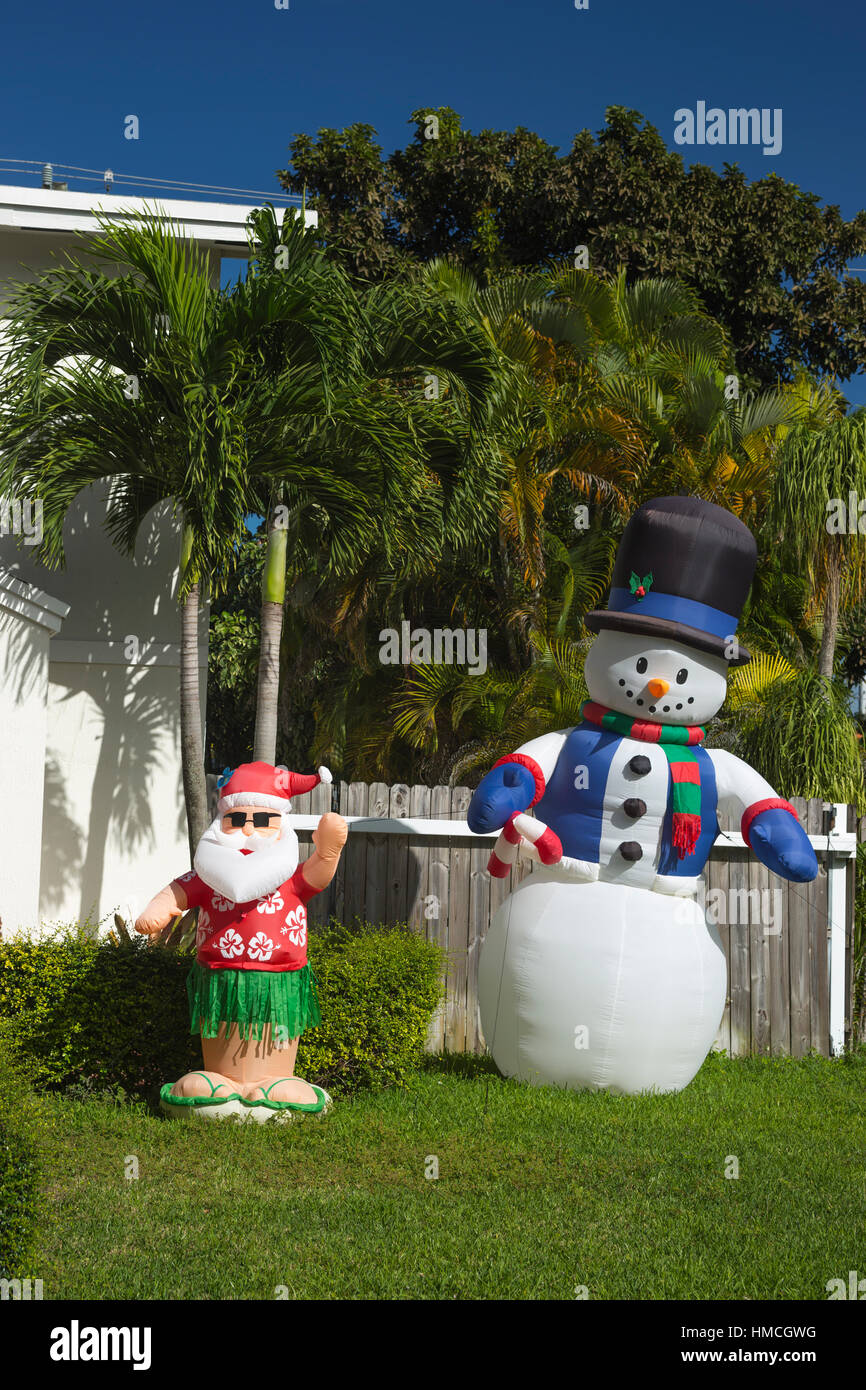 Inflatable Santa Claus And Snowman In Front Of Palm Trees In Stock