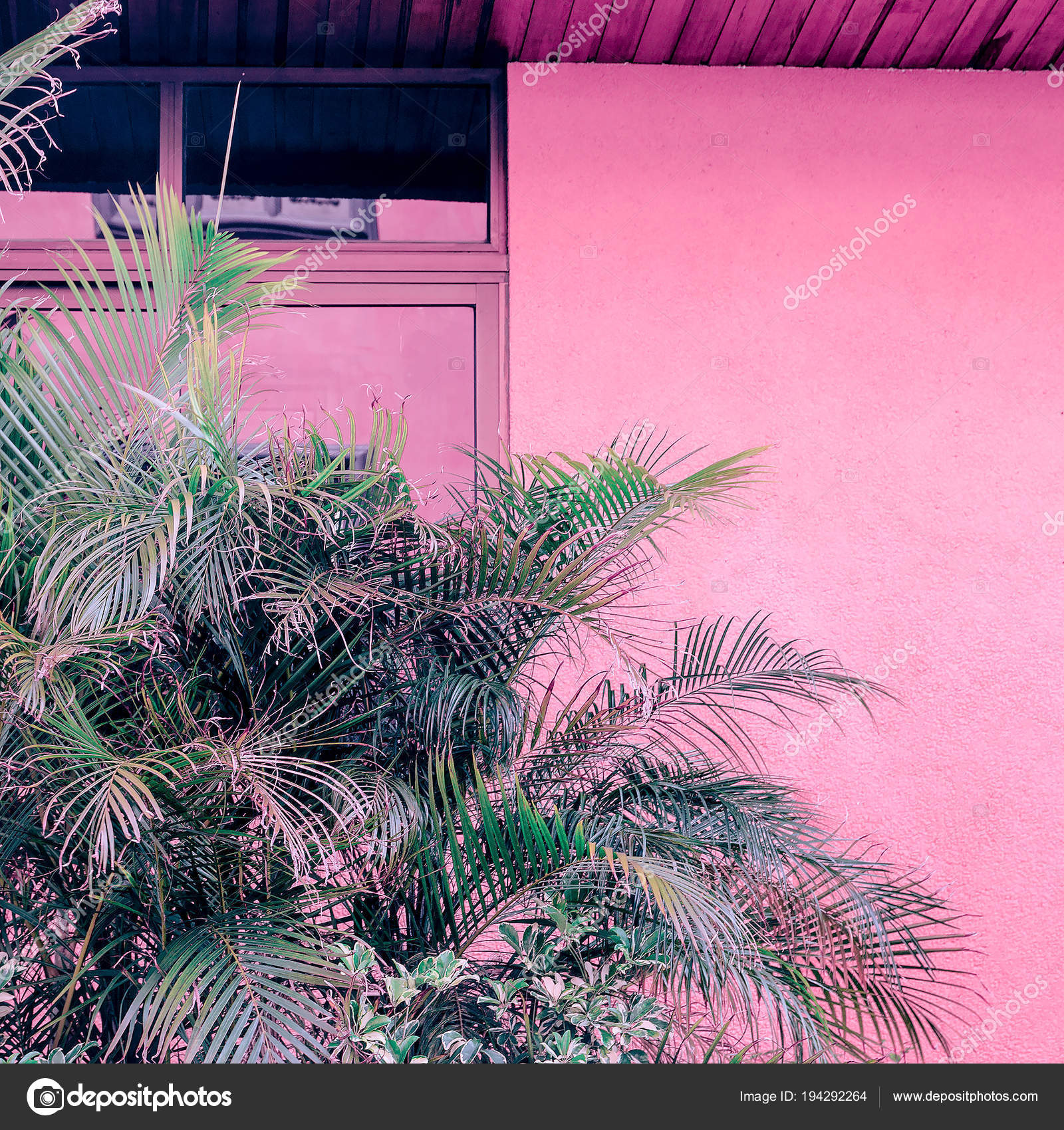 Plants On Pink Palm Outdoors Tropical Minimal Art Stock Photo