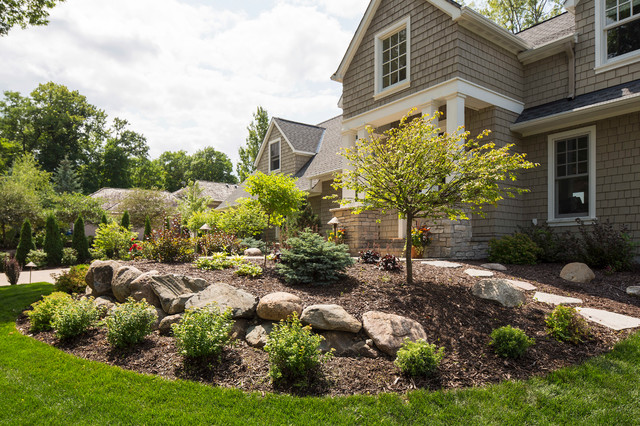 Front Yard With Boulder Wall And Shrub Bed Traditional Garden