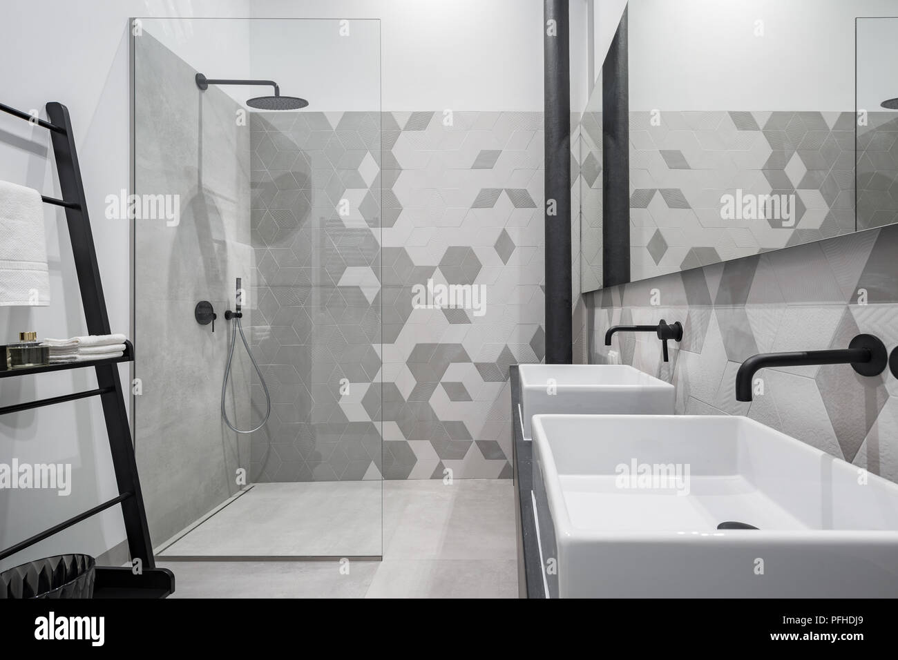 New Design Bathroom With Shower And Two Basins In Gray And White