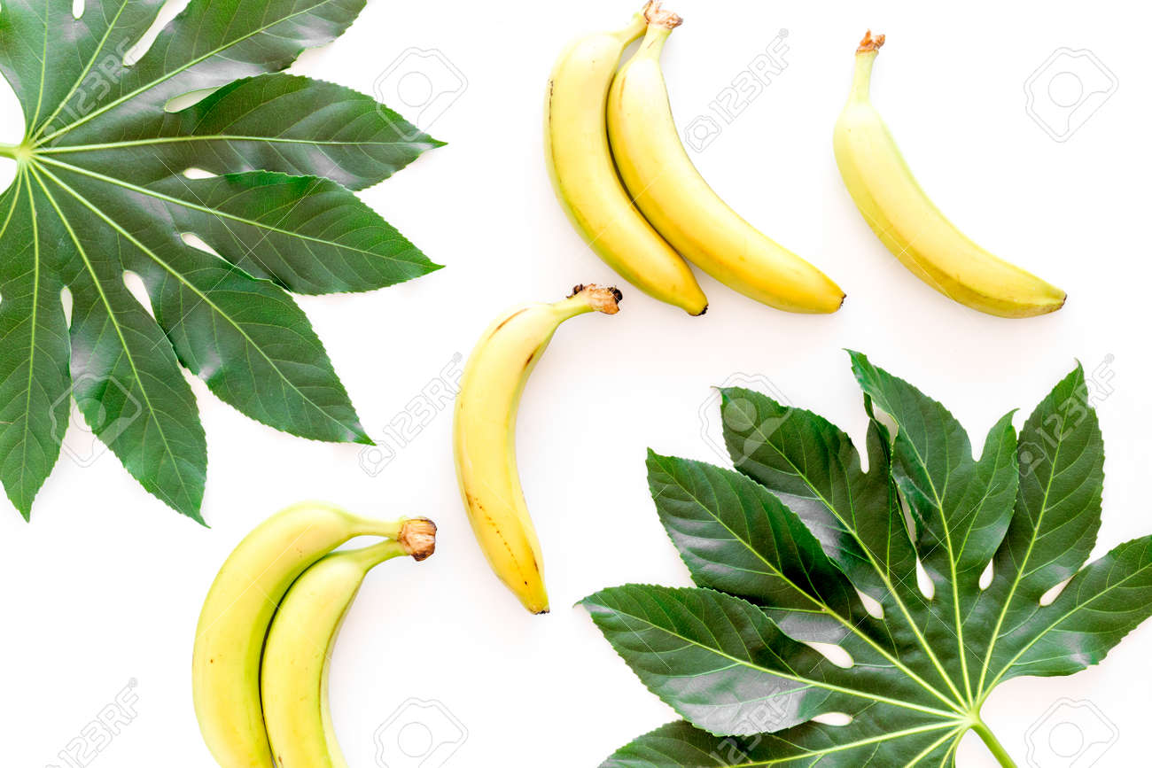 Tropical Plants Huge Leaves And Bananas On White Background
