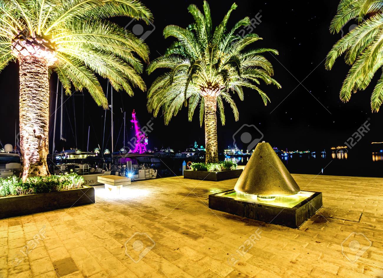 Palm Trees And The Buildings In The Night Lights In Marina Porto