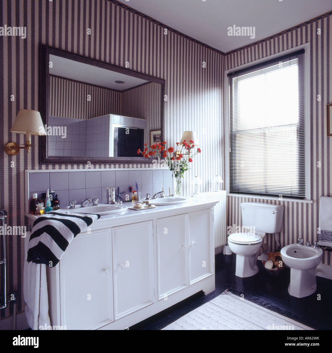 Pink Striped Wallpaper And Roll Top Bath In Country Bathroom With