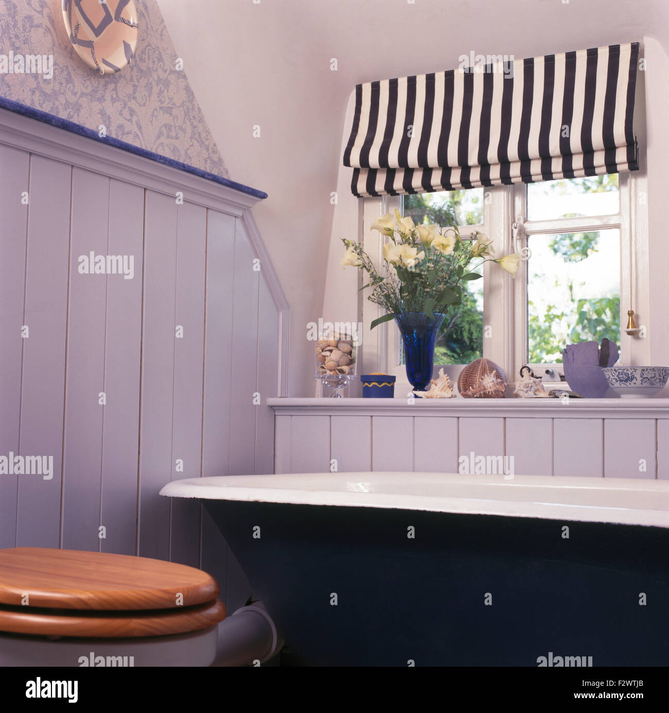 Black White Striped Blind On Window Above Roll Top Bath In Pale